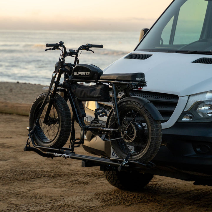 Heavy-duty, folding bike rack for electric bikes up to 200 lbs (91 kg.); fat tire bikes, electric motorbikes and more.